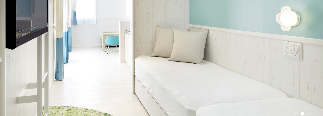 まずはアイランド長崎のお部屋からご紹介しましょう。客室は全103室で、ホテルは3棟、コテージは6棟。オーシャンビューの広々としたバルコニーがあるテラスロッジ、大好きな愛犬と一緒に泊まれるバークロッジ、子どもの夢がいっぱい詰まったキッズロッジなどがあります。